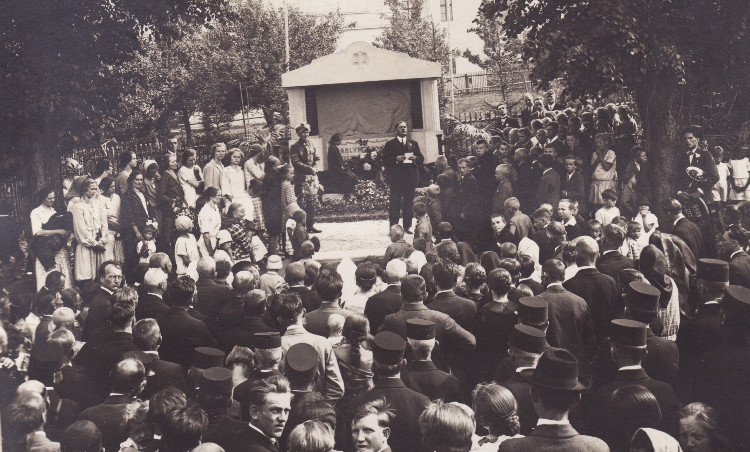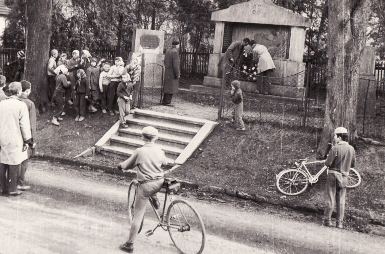 Nápad na stavbu pomníku padlým v 1. sv. válce přišel od členů ochotnicko-vzdělávacího spolku. Návrh nakreslil místní výtvarník Jindra Sedlák a po vyrobení v Krnově musel být pomník do Kyjovic dovezen na několika koňských povozech. Odhalení pomníku se konalo v červnu roku 1928.